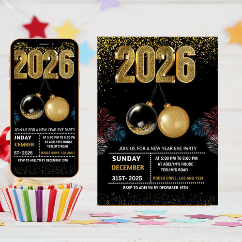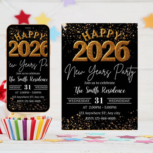 2026 New Year’s Eve Party Invite Editable, Gold Celebration New Year Digital Invitation, Black and Gold New Year Evite, Instant Download